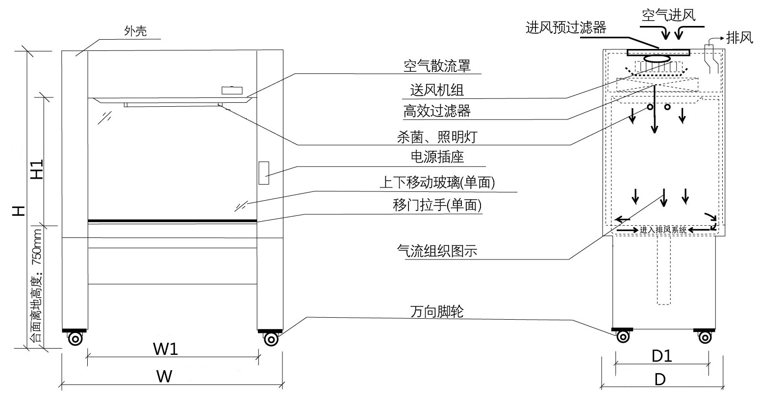 凈化工作臺(tái)由箱體、風(fēng)機(jī)、高效過(guò)濾器、操作開(kāi)關(guān)等幾大部件組成。箱體采用彩鋼板等制作,表面噴塑處理,工作臺(tái)面采用不銹鋼制作。凈化單元采用了可調(diào)風(fēng)量的風(fēng)機(jī)系統(tǒng),通過(guò)調(diào)節(jié)風(fēng)機(jī)的工作狀態(tài),可使?jié)崈艄ぷ鲄^(qū)中的平均風(fēng)速保持額定范圍內(nèi),而且有效地延長(zhǎng)了高效過(guò)濾器使用壽命。